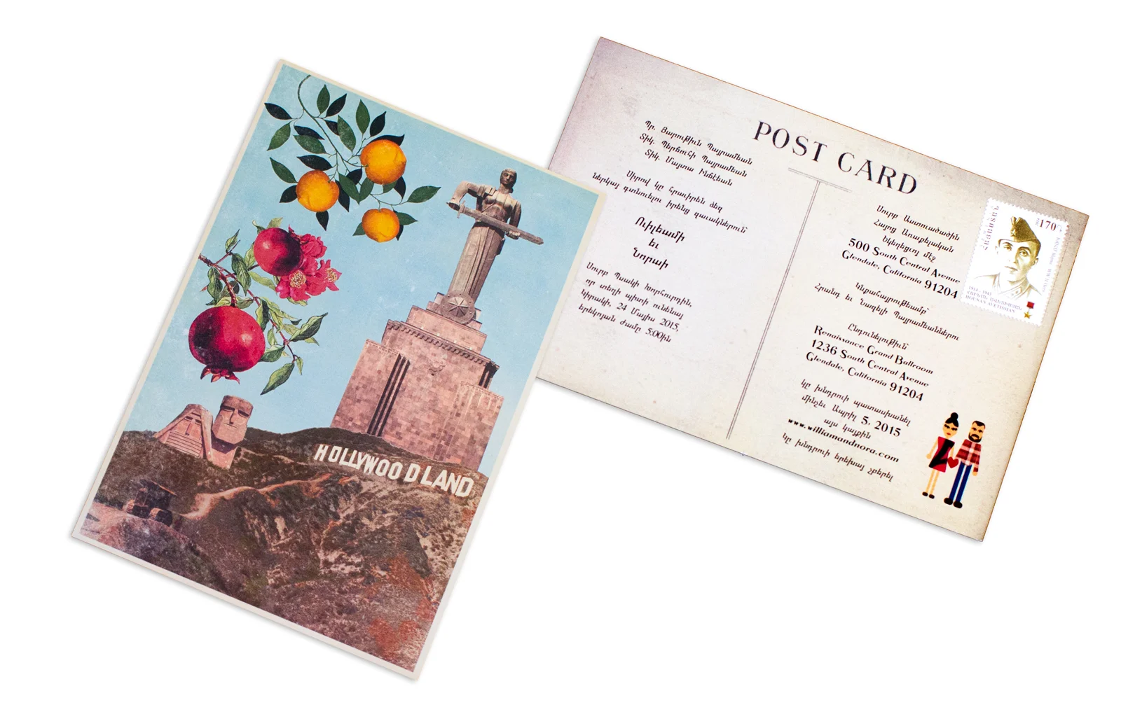 We took the images of Hollywoodland and combined it with images of the Mother Armenia statue and the “Babig Dadig” statue of Nagorno-Karabagh to create an antique chic card for their invitation.